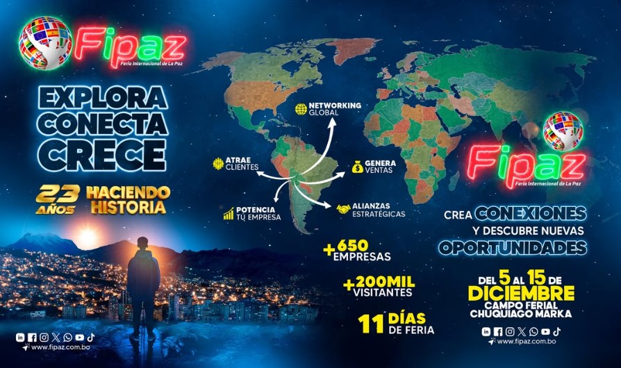 La inauguración oficial de la versión XXIII de la Fipaz será este viernes en el Campo Ferial Chuquiago Marka y el evento se extenderá hasta el 15 de diciembre. En sus primeros años, la feria se desarrolló y comenzó a crecer en el coliseo Julio Borelli y hoy se despliega en el recinto de Bajo Següencoma. Se trata del evento empresarial de relevancia internacional.