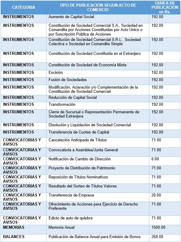 Los costos calculados para las publicaciones en el Portal de la Gaceta Electrónica de Registro de Comercio, se establecen de acuerdo a la categoría del documento, la misma que está relacionada directamente con el tipo de publicación. Dichos costos deben ser pagados a través de los medios de pago, habilitados por el Servicio Plurinacional de Registro de Comercio – SEPREC.