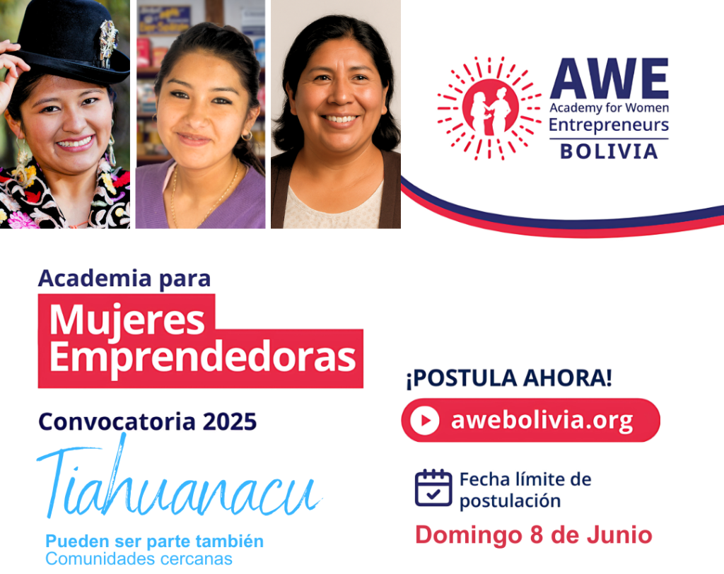 La Academia para Mujeres Emprendedoras (AWE Bolivia) anunció este miércoles la apertura de una nueva convocatoria dirigida a mujeres del municipio de Tiahuanacu, como parte de su compromiso por seguir fortaleciendo a emprendedoras del área rural boliviana. Las interesadas podrán postular a una beca del 100% hasta el domingo 8 de junio de 2025 en www.awebolivia.org.