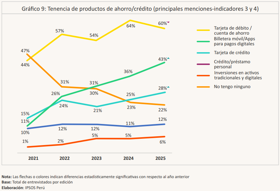 Su uso se cuadruplicó desde 2021, alcanzando al 43% de los ciudadanos latinoamericanos, mientras que la tenencia de tarjetas de débito se mantiene estable en torno al 60%. Este crecimiento demuestra que miles de personas se incorporan directamente al sistema financiero a través del teléfono móvil, sin haber pasado por productos tradicionales como las cuentas de ahorro.