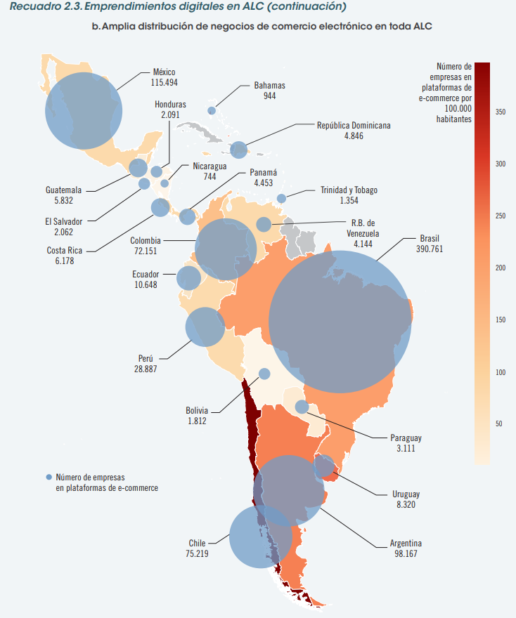 Actualmente, la región cuenta con alrededor de 837.000 tiendas en línea activas, concentradas principalmente en Brasil (390.761), México (115.494) y Argentina (98.167). En Sudamérica, destacan Chile (75.209), Colombia (72.151) y Perú (28.887). En términos per cápita, Chile, Uruguay y Argentina lideran la adopción del comercio electrónico, reflejando la influencia del ingreso, la infraestructura digital y los ecosistemas de apoyo emprendedor.