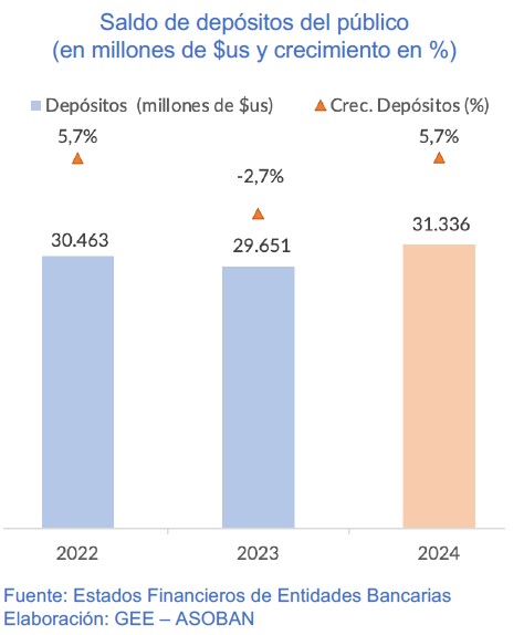 La cartera de créditos llegó a $us 29.204 millones registrando un aumento interanual de 4,6%. Por su parte, los depósitos crecieron 5,7% en comparación con el mismo período del año anterior, destacándose especialmente los depósitos a la vista como el principal motor de este incremento que alcanzaron $us 31.336 millones, con un aumento de 5,7%. La mora se situó en el 3,2%.