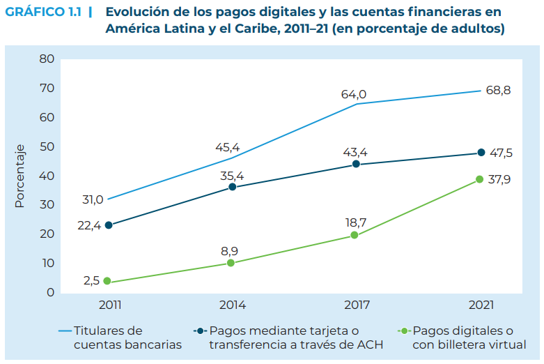 Es así que, en 2011, el número de personas que efectuaron o recibieron pagos mediante transacciones digitales en América Latina y el Caribe no llegó a 3 de cada 100 adultos. En la década siguiente hubo grandes cambios. En 2021, 4 de cada 10 adultos utilizaron cuentas de pagos digitales, lo cual marca un aumento del 120% en 10 años. El 50% de este incremento se produjo entre 2017 y 2021.