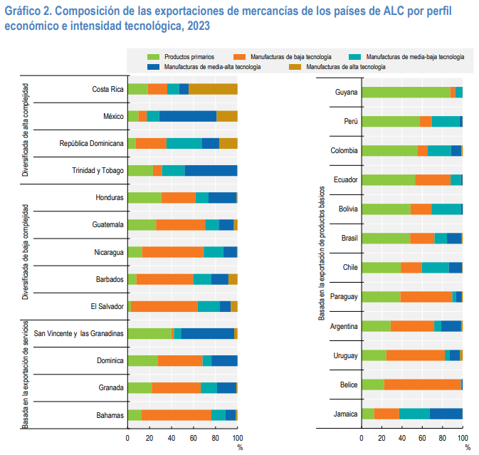 Solo 2,1 % del empleo correspondía a sectores de mediana o alta tecnología, comparado con 7,7 % en economías avanzadas, lo que evidencia un atraso en la adopción de tecnologías y una baja capacidad de innovación.